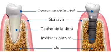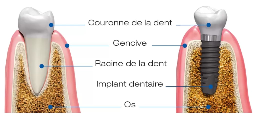 Un implant dentaire est une racine artificielle, fixée dans l’os de la mâchoire et destinée à remplacer une ou plusieurs dents. Composé le plus souvent de titane, il est parfaitement biocompatible avec l’organisme.